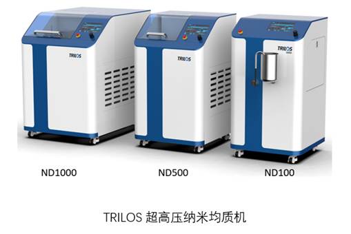 最后,将预分散后的浆料导入TRILOS 超高压纳米均质机进行精细处理,设备以超高压为核心驱动力,通过均质腔内物料高速喷射形成的剪切、撞击与空穴协同作用,将浆料中残余的微小团聚颗粒进一步破碎细化至纳米尺度,最终获得粒径均一、分散均匀、性能稳定的高品质浆料。