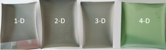The Ni-YSZ slurry is tape-cast using the KEKO tape caster to produce green sheets. The green sheets are dried at 120°C for 0.5 h to obtain tape-cast sheets 1-D, 2-D, 3-D, and 4-D. As can be seen from Figure 8, there are cracks and particles on the surfaces of tape-cast sheets 1-D and 2-D; there are sporadic particles and bubbles on the surface of tape-cast sheet 3-D; and tape-cast sheet 4-D has no bubbles or particles and has good uniformity.