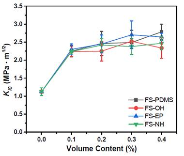 The following figure shows the type I fracture toughness (KIC) of silica-modified epoxy resin. Compared with the unmodified material, adding silica nanoparticles can increase the fracture toughness of epoxy resin. In addition, silica nanoparticles with reactive functional groups can also improve the high-energy impact resistance, Tg, and crosslinking density of epoxy resin.