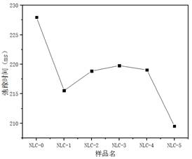 We use the Lisico dispersion and homogenization analyzer to test the dispersion stability of the sample. The results are shown in Figure 5. NLC-0 is the primary emulsion among the samples. NLC-1 to NLC-5 are the NLC liposomes after being processed 1 to 5 times at 1000 bar, respectively. It can be seen from the figure that after homogenization once, the relaxation time of the sample decreases significantly, indicating that its dispersion stability is greatly improved. With the further increase of the homogenization times, the relaxation time of the sample increases slightly. After homogenization 5 times, the relaxation time of the NLC-5 sample reaches the minimum, and the dispersion stability is the best.