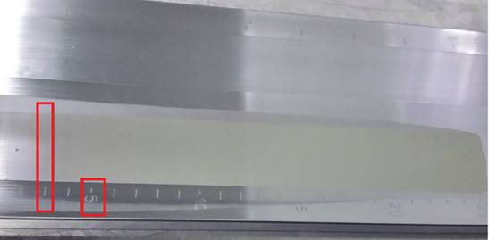 By the detection of a hegman gauge, the fineness reached 8 μm after 5 steps, approaching the requirement 7 μm. On this basis, the sixth grinding and dispersion proceeded, and the final fineness reached 3 - 4 μm, close to the initial particle fineness of 3 μm of the silver paste, effectively improving the fineness and uniformity of the overall paste dispersion and enhancing the product quality. The fineness is shown in the figure below.