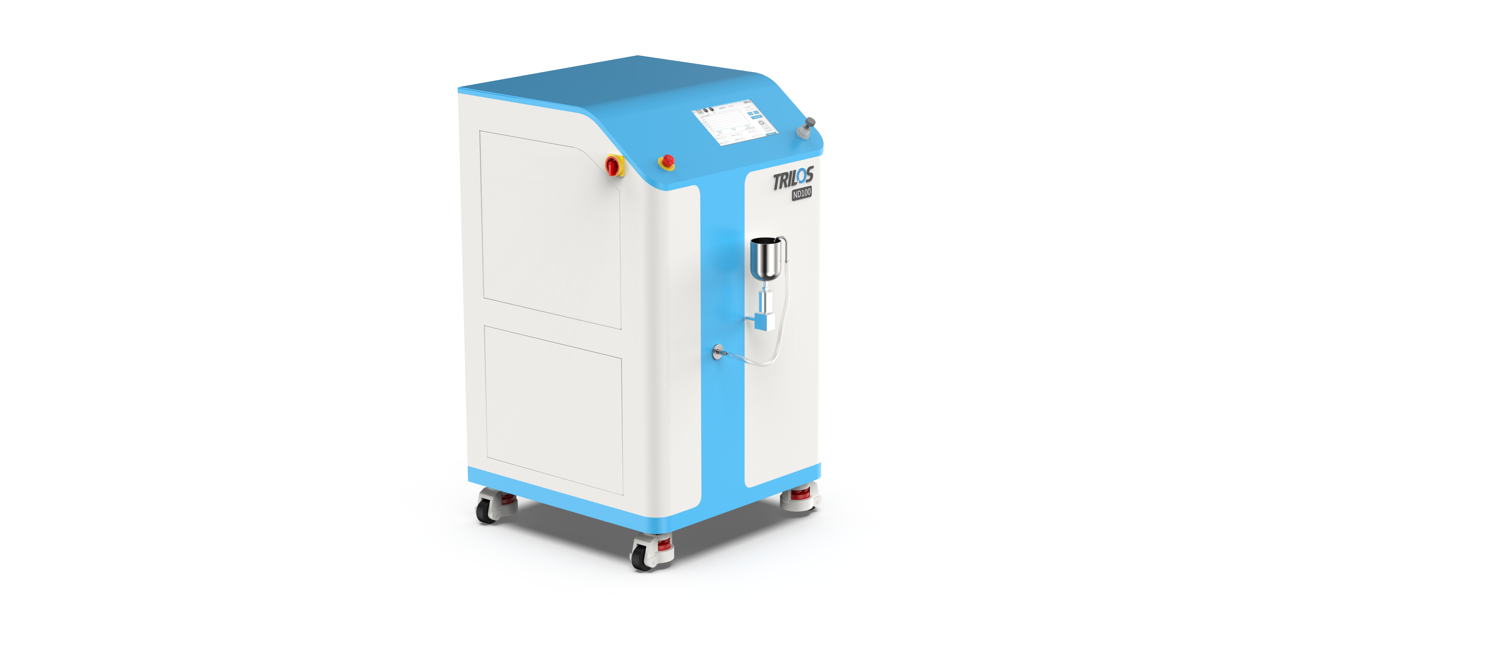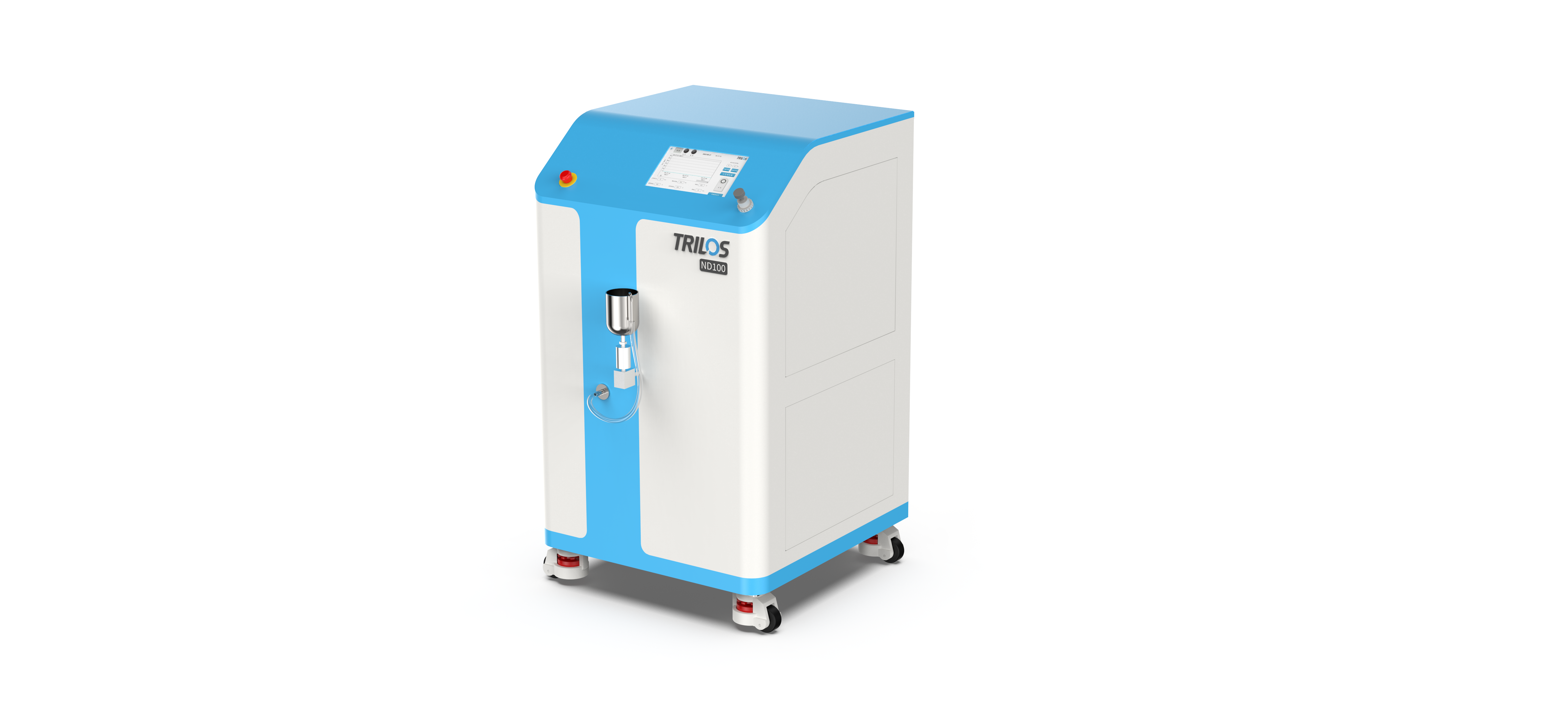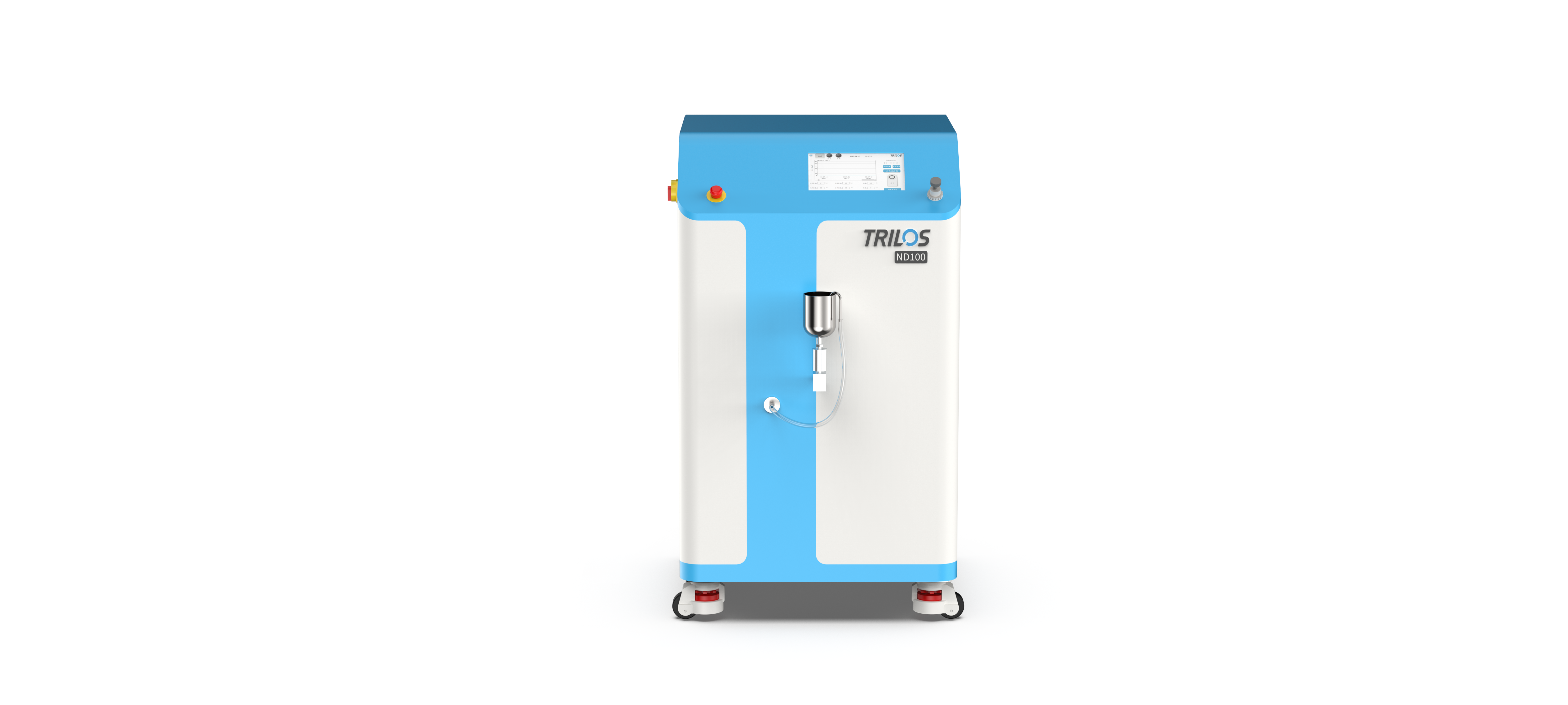 TRILOS ND100 is the lab model homogenizer. It is suitable for laboratorians to finish samples and make lab-scale production. Its flow rate reaches maximum 5L/h when the pressure keeps at 3000bar. The inlet is a half-opened container and the outlet is connected with rubber tube. Both of them are in the front of the homogenizer for users to easily feed and collect.